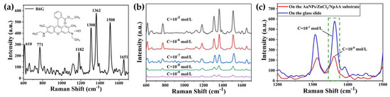 Figure 4a shows the Raman spectrum of the R6G solution (10−1 mol/L) on a quartz substrate, and it is evident that most of its Raman characteristic peaks are located between 600 cm−1 and 1700 cm−1, mainly 610, 771, 1182, 1308, 1362, 1508, and 1651 cm−1, all of which characterize part of the structural information of R6G [29,30]. Among them, the spectral peaks at different positions are attributed as follows: 610 cm−1 belongs to C-C-C ring bending vibrations, 771 cm−1 and 1182 cm−1 characterize C-H out-of-plane and in-plane bending vibrations, respectively, 1308 cm−1 is attributed to N-H in-plane bending vibrations, 1362 cm−1 represents C-N stretching vibrations, and 1508 cm−1 and 1651 cm−1 both belong to the aromatic C-C stretching vibrational state. Figure 4b shows the SERS spectra of the R6G solution with the concentration decreased from 10−5 mol/L to 10−9 mol/L. At this time, R6G was located on the AuNPs/ZnCl2/NpAA substrate, and the main characteristic peaks were still clearly visible at the low concentration (10−9 mol/L), which indicated that the detection limit of this substrate for R6G was up to 10−9 mol/L.