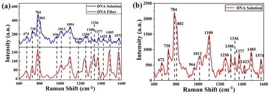 (a) Raman spectra of ctDNA in both fiber and solution (concentration of 9.5 × 10−2 mol/L); (b) SERS spectra of ctDNA when diluted to a concentration of 10−6 mol/L.