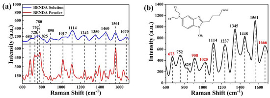 Figure 6a shows the Raman spectra of BENDA powder and solution (concentration 5 × 10−2 mol/L). It can be seen that the main Raman peaks of BENDA solution are concentrated in the range of 600 cm−1 to 1700 cm−1, which mainly contain the following peaks: 680, 728, 752, 780, 825, 890, 1017, 1114, 1242, 1350, 1460, 1561, and 1670 cm−1.