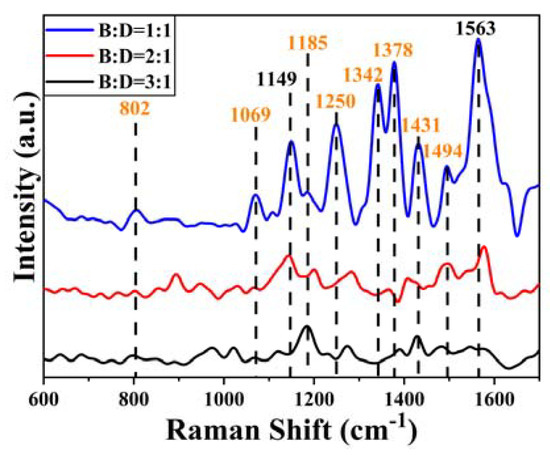 Figure 7 shows the SERS spectra of the mixed solutions of BENDA and ctDNA at different molar ratios (1:1, 2:1, 3:1), and it can be seen that the main characteristic peaks of the BENDA-ctDNA complex contain 802, 1069, 1149, 1185, 1250, 1342, 1378, 1431, 1494, and 1563 cm−1, and the peak attribution of each characteristic peak is listed in Table 1.
