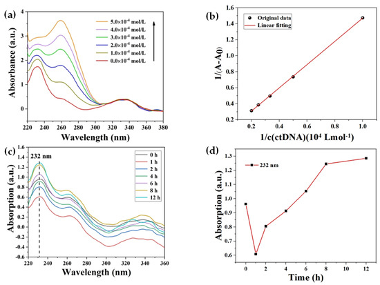 (a) UV–vis absorption spectra of BENDA–ctDNA complexes measured at different ctDNA concentrations; (b) linear variation of with ; (c) UV–vis absorption spectra of BENDA–ctDNA complexes at different times; (d) absorbance of BENDA–ctDNA complexes at 232 nm at different times.