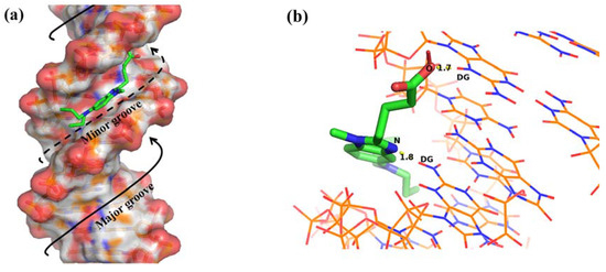 (a) Binding of BENDA (green) in the DNA minor groove obtained by molecular docking simulation; (b) site of hydrogen bond formation, DG: Deoxyguanosine.