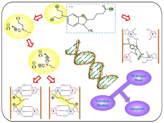 Based on the above experimental results, a model of the mechanism of action of BENDA with DNA can be deduced. Since the amount of information observed at the A and T bases is minimal and the C base is not a major site of action, we will only discuss information on G base interactions. As shown in Figure 10, BENDA possesses four active sites (at the light green circles), namely the two Cl atoms in the alkylation group of 2-chloroethylamine, the N atom on the benzimidazole ring, and the O atom of the hydroxyl group (-OH) on the side chain of butyric acid. In this case, the process with the alkylation group of the G base is shown in the route on the left side of Figure 10, where the Cl atoms in the BENDA molecule detach one after another, making the detached site extremely electrophilic and thus covalently bound to the N7 site of the G base. The route on the right side of Figure 10 shows the location of the hydrogen bonds formed between the N atom in the benzimidazole ring and the O atom in butyric acid (at the light-yellow rectangular box), which create hydrogen bonds with the amino (NH2) and imino (NH) groups in the G base, respectively, enhancing the drug–DNA interaction even more. These two different DNA action pathways together lead to intra- and interstrand cross-linking of its double helix, which ultimately triggers the apoptotic mechanism of DNA. Notably, covalent interaction (i.e., alkylation binding)-induced inter- and intra-strand cross-links play a dominant role, while non-covalent interaction (groove binding and electrostatic binding) plays a secondary role.