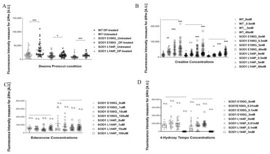 Scatter plots of the average inner mitochondrial membrane potential by TMRE measurement of SOD1 and WT hSKM after treatment with (A) Deanna Protocol (DP), (B) Creatine, (C) Edaravone, and (D) 4-Hydroxy Tempo (Tempol). TMRE signal was measured in and reported for fluorescent intensity. Error bars: SEM * p < 0.1, ** p < 0.01, *** p < 0.001, n.s. = not significant.