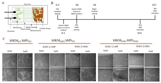 Illustration of SOD1 and WT NMJ culture with and without creatine treatment. (A) Cartoon illustration of the NMJ chamber. (B) Experimental timeline for iPSC hSKM and hMN plating and subsequent creatine treatment. (C) Phase images for the co-cultures of hSKMWT hMNWT, hSKMSOD1 hMNWT and hSKMSOD1 hMNSOD1 with/without creatine. Scale bar = 100 µm.