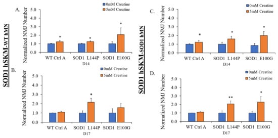 Quantification of NMJ numbers in NMJ cultures with and without creatine treatment at D14 and D17 days of differentiation. The results from different co-cultures are illustrated. (A) D14 hSKMSOD1 hMNWT, (B) D17 hSKMSOD1 hMNWT, (C) D14 hSKMSOD1 hMNSOD1, and (D) D17 hSKMSOD1 hMNSOD1. Result: Mean. Error bars: SEM * p < 0.1, ** p < 0.01.