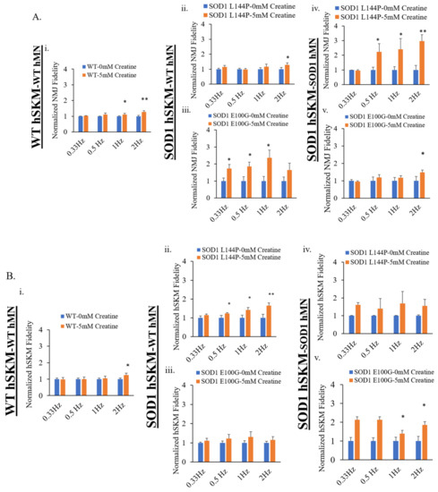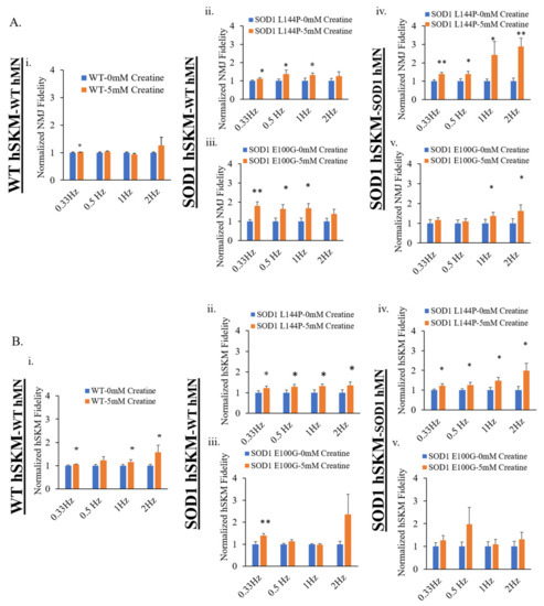 Quantification of NMJ fidelity and direct muscle contraction fidelity in the D17 NMJ co-culture with and without creatine treatment. (A) NMJ fidelity collected under MN stimulation. (B) SKM contraction fidelity collected under SKM direct stimulation. Results from the NMJ co-cultures of different genetic combinations were displayed: (i) WT, (ii) SOD1L144P SKM-WT MN, (iii) SOD1E100G SKM-WT MN, (iv) SOD1L144P SKM-SOD1L144P MN, (v) SOD1E100G SKM-SOD1E100G MN. Data: Mean. Error bars: SEM, * p < 0.1, ** p < 0.01.