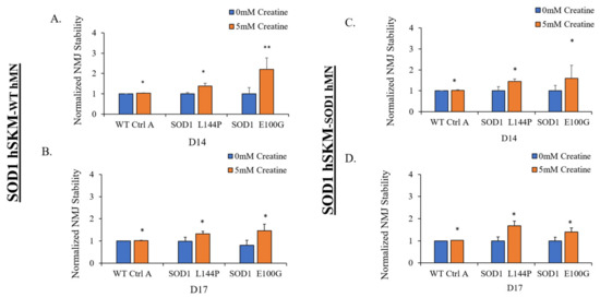 The therapeutic effect of creatine on NMJ stability was also assessed. This is because a decline in NMJ stability is a commonly reported ALS clinical symptom [23]. This parameter was measured to evaluate preservation of NMJ function in ALS co-cultures following exposure to a paradigm of NMJ stimulation at increasing frequency, as in fidelity testing. NMJ stability was calculated as the number of NMJs counted after the fidelity testing paradigm divided by number of NMJs pre-fidelity testing [9,12]. Compared to the untreated condition, NMJs in the creatine-treated ALS co-cultures were found to be more stable (Figure 7). The observation was made in hSKMSOD1-hMNWT and hSKMSOD1-hMNSOD1 on both day 14 and 17 of co-culture. These results demonstrate that hSKM-specific creatine treatment increases ALS NMJ stability.