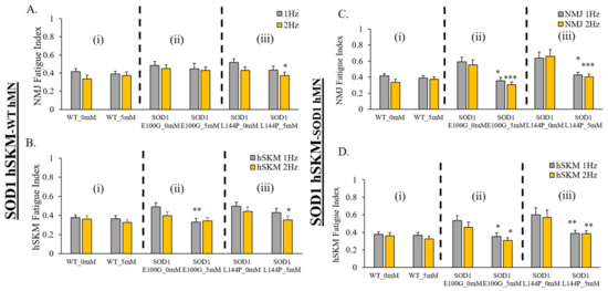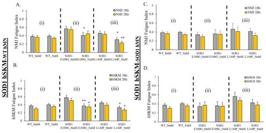 Quantification of the fatigue index for NMJ-stimulated SKM and direct SKM stimulation in the D17 NMJ co-culture with and without creatine treatment. (A) NMJ fatigue index collected under MN stimulation. (B) SKM fatigue index collected under SKM direct stimulation. Results from the NMJ co-cultures of different genetic combinations are displayed: (A,B) In the co-culture of hSKMSOD1 hMNWT, fatigue index of NMJ (A) and SKM (B). (C,D) In the co-culture of hSKMSOD1 hMNSOD1, fatigue index of NMJ (C) and SKM (D). (i) WT (ii) SOD1E100G (iii) SOD1L144P. Error bars: SEM * p < 0.1, ** p < 0.01.
