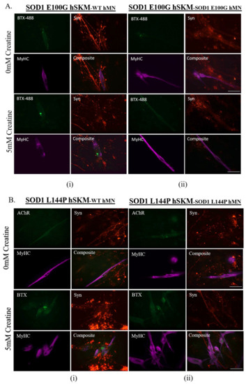 Immunocytochemistry analysis of the D17 NMJ co-culture with and without creatine treatment utilizing the markers BTX-488 (green) for AchR and Myosin Heavy Chain (MyHC) (red) or Synaptophysin (syn, red) for myotubes. (A) For the co-cultures containing the SOD1 E100G mutation. (B) For the co-cultures containing the SOD1 L144P mutation. Sample images from the NMJ co-cultures of different genetic combinations are displayed: hSKMSOD1 hMNWT and hSKMSOD1 hMNSOD1. Scale bar = 100 µm.