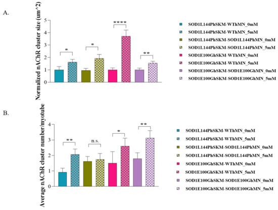 The first parameter evaluated was NMJ formation as NMJ regeneration and maintenance are known to be impaired in ALS [6]. hSKM-specific creatine treatment significantly increased NMJ numbers in both SOD1L144P and SOD1E100G co-cultures for both hSKMSOD1-hMNWT and hSKMSOD1-hMNSOD1 compared to untreated controls (Figure 4). This was true on both days 14 and 17 of co-culture. An increase in NMJ numbers in hSKMSOD1-hMNWT systems was within expectation since the hSKM side of the chambers were treated (Figure 4A,B). It is worth noting that significantly increased NMJ numbers were also observed in creatine-treated hSKMSOD1-hMNSOD1 co-cultures. Immunocytochemical assessment of NMJs from treated and untreated conditions post-test provided insight into these observations. While there were no apparent changes to the hMN axons between treated versus untreated in any of the ALS co-culture conditions, ALS hSKM in creatine-treated chambers had significantly larger AChR clusters compared to untreated (Figure 10 and Figure 11). Additionally, myotubes in the treated conditions had a comparatively higher number of AChR clusters per myotube than untreated (Figure 11B). The formation of larger AChR clusters is likely a result of a generally increased protein expression upon creatine supplementation [34,37]. Increased AChR clusters per myotube in turn enhanced NMJ formation possibilities in the creatine condition. Overall, creatine supplementation boosted NMJ formation in ALS co-cultures.