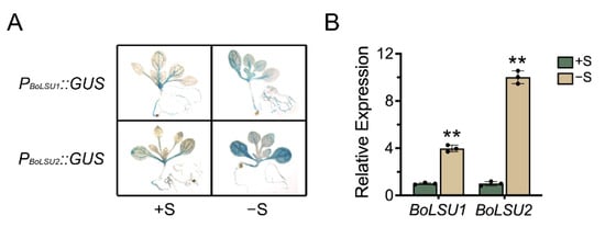 The expression of BoLSU1 and BoLSU2 under normal sulfur (+S) and sulfur deficiency (−S) conditions. (A) BoLSU1 and BoLSU2 promoter-directed GUS expression in Arabidopsis. (B) Relative expression of BoLSU1 and BoLSU2 under −S conditions in broccoli analyzed by qRT-PCR. Scatter plots indicate three biological replicates. Error bars indicate SE of triplicate replicates. Asterisks indicate significant differences between +S and −S, ** p < 0.01 by Student’s t test.