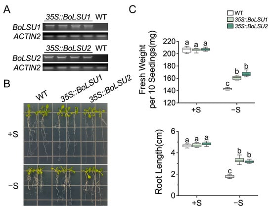 To explore the roles of BoLSU1 and BoLSU2 in sulfur deprivation, we constructed transgenic plants overexpressing either BoLSU1 and BoLSU2 (35S::BoLSU1 and 35S::BoLSU2) (Figure 2A). Wild-type and transgenic seedlings were then grown simultaneously on a normal and sulfur deficient media, respectively. In normal conditions, no significant differences were observed in 35S::BoLSU1 and 35S::BoLSU2 compared to wild-type. However, under sulfur deficiency, the wild-type plants displayed a decrease in fresh weight and root length while 35S::BoLSU1 and 35S::BoLSU2 were significantly less affected (Figure 2B,C).