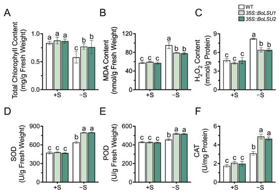 The effect of sulfur deficiency (−S) on total chlorophyll content (A) Malondialdehyde content (B) H2O2 content (C) activity of Superoxide Dismutase (D) Peroxidase (E) and Catalase (F) in WT, 35S::BoLSU1 and 35S::BoLSU2. Different letters indicate significant differences (Tukey’s post hoc test, p < 0.05).