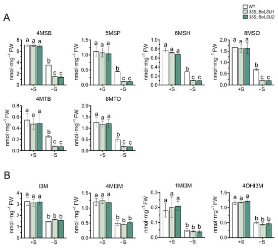 Effects of sulfur deficiency (−S) on glucosinolate content in WT, 35S::BoLSU1, and 35S::BoLSU2. (A) Effects of −S on aliphatic glucosinolate contents. 4MSB, 4-Methylsulfinyl-n-butyl glucosinolate; 5MSP, 5-Methylsulfinyl-n-pentyl glucosinolate; 6MSH, 6-Methylsulfinyl-n-hexyl glucosinolate; 8MSO, 8-Methylsulfinyl-n-octyl glucosinolate; 4MTB, 4-Methylthio-n-butyl glucosinolate; 8MTO, 8-Methylthio-n-octyl glucosinolate. (B) Effects of −S on indolic glucosinolate contents. I3M, Indol-3-ylmethyl glucosinolate; 4MI3M, 4-Methoxyindol-3-ylmethyl glucosinolate; 1MI3M, 1-Methoxyindol-3-ylmethyl glucosinolate; 4OHI3M, 4-Hydroxyindol-3-ylmethyl glucosinolate. Different letters indicate significant differences (Tukey’s post hoc test, p < 0.05).