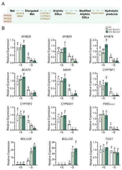 Expression of key genes in aliphatic glucosinolate metabolic pathway under normal sulfur (+S) and sulfur deficiency (−S) conditions. (A) Schematic diagram of aliphatic glucosinolate metabolic pathway. Met, methionine; GSLs, glucosinolates. Metabolites are depicted in black. Transcription factors (MYB28, MYB29 and MYB76) and enzymes are depicted in brown. (B) Relative expression level of genes of aliphatic glucosinolate metabolic pathway in WT, 35S::BoLSU1 and 35S::BoLSU2. Scatter plots indicate three biological replicates. Different letters indicate significant differences (Tukey’s post hoc test, p < 0.05).