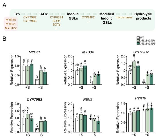 Expression of key genes in indolic glucosinolate metabolic pathway under normal sulfur (+S) and sulfur deficiency (−S) conditions. (A) Schematic diagram of indolic glucosinolate metabolic pathway. Trp, tryptophan; IAOx, Indole-3-acetaldoxime; GSLs, glucosinolates. Metabolites are depicted in black. Transcription factors (MYB34, MYB51 and MYB122) and enzymes are depicted in brown. (B) Relative expression level of genes of indolic glucosinolate metabolic pathway in WT, 35S::BoLSU1 and 35S::BoLSU2. Scatter plots indicate three biological replicates. Different letters indicate significant differences (Tukey’s post hoc test, p < 0.05).