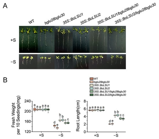Under normal conditions, no considerable difference was observed between wild-type, bglu28bglu30, 35S::BoLSU1, 35S::BoLSU2, 35S::BoLSU1/bglu28bglu30 and 35S::BoLSU2/bglu28bglu30 (Figure 7A). However, when S supply is lacking, all genotypes showed a decrease in fresh weight and root length, with the bglu28bglu30 displaying a greater decrease compared to wild-type (Figure 7B). This suggested that BGLU28 and BGLU30 are essential in resisting sulfur deficiency stress. In addition, overexpressing BoLSU1 and BoLSU2 in the bglu28bglu30 background did not improve sulfur deficiency tolerance as much as in wild-type background (Figure 7A,B), suggesting that BoLSU1- and BLSU2-mediated sulfur deficiency tolerance depends on BGLU28 and BGLU30.