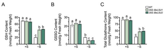 To investigate whether BoLSU1 and BoLSU2 mediated degradation of GSLs promotes S flow to GSH, we examined the content of GSH and GSSG in 35S::BoLSU1 and 35S::BoLSU2. Under sulfur deficiency conditions, the content of GSH, as well as the GSH pool (total content of GSH and GSSG), significantly decreased, and a lower decrease was detected in 35S::BoLSU1 and 35S::BoLSU2 compared to wild-type plants (Figure 8A,C). In contrast, the content of GSSG were more decreased in 35S::BoLSU1 and 35S::BoLSU2 than in wild-type (Figure 8B). Combined with the above results, it can be inferred that overexpression of BoLSU1 and BoLSU2 promotes the degradation of GSLs and the release of sulfur, thus promoting the flow of sulfur from the GSLs pool to the GSH pool, and thus enhancing the antioxidant capacity and improving the tolerance to sulfur deficiency.