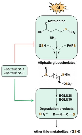 GSLs are a class of sulfur-containing secondary metabolites common in Brassicacea species. Structurally, they are composed of an S-linked thioglucose unit, an O-sulfated (Z)-thiohydroximate group and a side chain derived from an amino acid []. GSLs can be further categorized into aliphatic, indolic and aromatic groups based on the structures of the amino acid side chains []. Since the GSL molecules contain 2–3 sulfur atoms, their biosynthesis and accumulation require a large amount of sulfur. In Brassicaceae plants, the sulfur integrated by GSLs makes up 30% or even more of the total sulfur []. Therefore, the biosynthesis and degradation of GSLs significantly affects the metabolism of S-containing compounds as well as the reallocation of S among these compounds.