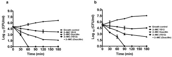 The synergistic effect of peptide YS12 with oxacillin against (a) E. coli KCTC 1923 (b) P. aeruginosa KCTC 1637. The time-killing effect of the combination of 2 × MIC (12 µg/mL) of peptide YS12 with 2 × MIC (96 µg/mL) oxacillin against E. coli and 2 × MIC (24 µg/mL) of peptide YS12 with 2 × MIC (48 µg/mL) oxacillin against P. aeruginosa was compared with the effect of 2 × MIC of peptide YS12, 2 × MIC of oxacillin alone, or untreated control.