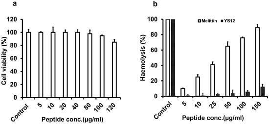 (a) Cell viability using Raw 264.7 cells was measured. Raw 264.7 cells were treated with peptide YS12 (5–120 µg/mL). (b) The hemolytic activity of peptide YS12 and Melittin with different concentrations (5–150 µg/mL) was determined. Each bar represents the mean ± SV obtained from three independent experiments, each performed in triplicate.