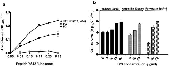(a) Aggregation of large unilamellar vesicles (LUV). A quantity of 400 µM LUV with PE: PG (7:3, w/w) PG and PC were added to a solution containing different ratios of peptide YS12, and aggregation was observed at 405 nm. (b) E. coli cell survival was checked after treatment with lipopolysaccharide (LPS) either itself or in combination with ampicillin (10 µg/mL), polymyxin (5 µg/mL), and peptide (25 µg/mL).