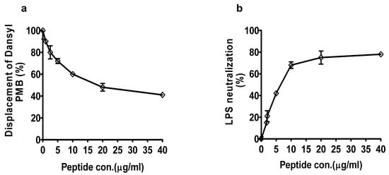 We also conducted the dansyl-polymyxin B displacement experiment to quantify the LPS binding affinity of peptide YS12. DPX works effectively as an indicator for cationic bindings on both purified LPS and whole bacterial cells []. However, DPX is nonfluorescent in free solution but exhibits high fluorescence when bound with LPS []. As seen in Figure 4a, peptide YS12 was bound to LPS by replacing the dansyl PMB and decreased fluorescence from 90% to 40% at 2.5 and 40 µg/mL, respectively. The peptide YS12 exerted an electrostatic interaction with LPS that contributed to its excellent antimicrobial activity against Gram-negative bacteria. Additionally, we evaluated the LPS neutralization activity of peptide YS12 using a Limulus amebocyte lysate (LAL) test. Different concentrations of YS12 (2.5–40 µg/mL) and 1 ng/mL LPS were employed. In Figure 4b, we found that peptide YS12 neutralized LPS in a dose-dependent manner and showed 78% neutralization at the maximum concentration of 40 µg/mL. These results indicated that the peptide YS12 showed significant effects on LPS. Numerous studies have shown that AMPs have a higher affinity for binding LPS to Gram-negative bacteria [].