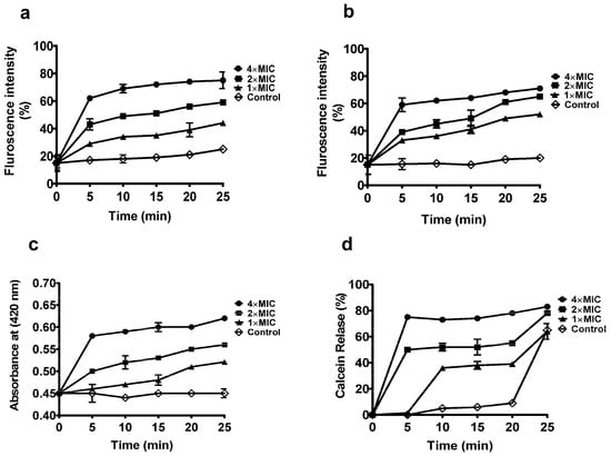 Moreover, a colorimetric and spectrophotometric substrate (ONPG) is usually used to measure the β-galactosidase activity in the inner membrane. To assess the effect of peptide YS12 on the inner membrane of E. coli, ONPG was used as β-galactosidase. The bacterial cytoplasmic membrane consists of negatively charged hydroxyl phospho-lipids, which facilitate the binding of cationic AMPs []. In Figure 5c, peptide YS12 caused rapid permeabilization of the E. coli membrane. The fluorescence intensity was gradually increased in a time- and concentration-dependent manner. The experimental results using PI and ONPG demonstrated that the peptide YS12 affected the integrity of the bacterial inner membrane, which ultimately led to cell death. Furthermore, by measuring the release of calcein from negatively charged liposomes, the membrane permeabilization capability of peptide YS12 was also detected. Peptide YS12 resulted in membrane disruption by inducing over 80% calcein leakage from calcein-loaded liposomes at the highest concentration of 4 × MIC (Figure 5d). Collectively, our results revealed that the peptide YS12 damaged the bacterial membrane by increasing PI intake, cytoplasmic-galactosidase release, and calcein release. These results would provide a better understanding of the mechanism of action of antimicrobial peptides (AMPs). Other studies also suggested that the antimicrobial peptides (AMPs) treatment enhanced bacterial membrane destruction [,].