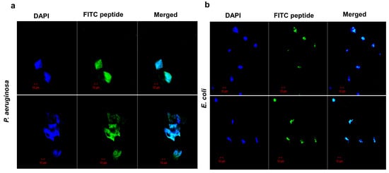 In this study, we employed Fluorescein isothiocyanate (FITC)-labeled YS12 dye to investigate the entrance of the peptide YS12 into bacterial cells. Peptide localization on bacterial cells was visualized using confocal laser microscopy. FITC-labeled YS12 corresponding to a 4 × MIC or 24 µg/mL and 4 × MIC or 48 µg/mL value was applied on P. aeruginosa KCTC 1637 and E. coli KCTC 1923 strains, respectively, for 30 min. In Figure 6a,b, we observed that FITC-labeled YS12 translocated into the bacterial cell by aggregating in the cytoplasm. The results of this study proved that peptide YS12 accumulated in the cytoplasm of the cells.