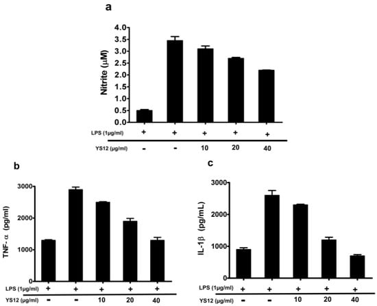 Effects of peptide YS12 on inhibiting proinflammatory cytokines including TNF-α, IL-1β, and NO. (a) The amount of NO was measured by Griess reagent in a concentration-dependent manner. (b) The effect of peptide YS12 was determined on cytokines including TNF-α, and (c) IL-1β. Each bar represents the mean ± SV of three independent trials.