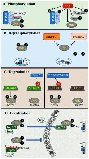 Apart from the sequential phosphorylation of the JNK cascade’s components, the transmission of signals via this pathway is stringently regulated by several other processes, including phosphorylation, dephosphorylation, degradation, subcellular localization, and protein-protein interactions [7,28,29,30,31,32]. These mechanisms are responsible for determining the specificity of the cascade by dictating the duration, strength, and substrate specificity of the signals. As mentioned above, the activation is regulated mainly by activating phosphorylation, which is often modulated by other intracellular components. These include scaffold proteins and other regulators that bring the components into close proximity to their proper activators and effectors, thus enhancing the signaling kinetics and determining proper localization. These activatory parameters have already been well covered in previous reviews [8,21,33,34]. On the other hand, the mode of inactivation or downregulation of the cascade, which is mainly mediated by phosphorylation/dephosphorylation and supported by degradation, protein interaction, and changes in localization, is not covered as well. These points are described below (see also Figure 1).