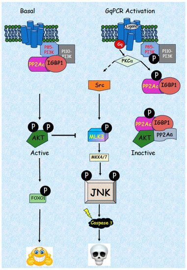 PP2A switch regulates JNK-dependent apoptosis via inhibition of PI3K and AKT activitis. In resting cells (left side) PP2Ac-IGBP1 dimer binds PI3K and maintains its activity by dephosphorylating PI3K on its autoinhibitory p85-PI3K Ser608 residue. Active PI3K activates AKT via phosphorylation, which leads to inhibition of the MLK3-MKK4/7-JNK apoptotic pathway, thus induces cell survival. Upon GqPCR activation (right panel), PKC inhibits the activator of JNK pathway Src by phosphorylation. In addition, activated PKC phosphorylates S24-PP2Ac, causing the PP2Ac-IGBP1 dimer to dissociate from PI3K (thus allowing autoinhibitory phosphorylation on p85-PI3K Ser608 residue). A heterotrimer of PP2c-IGBP1-PP2Aa is formed, binds and dephosphorylates the activatory AKT residues, rendering AKT inactive to allow alleviation of the AKT-dependent MLK3 inhibition and thus activation of the JNK pathway that leads to apoptosis.