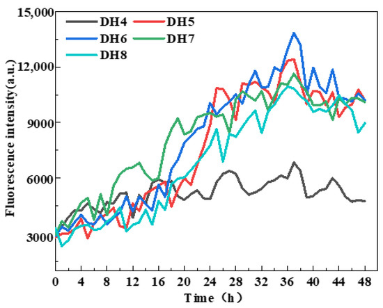 WGP fibrillation was assessed by measuring ThT fluorescence intensity [29] based on previous studies showing that the enhancement of ThT fluorescence intensity indicates cross-β structure generation [18,24]. According to Figure 2, the ThT fluorescence intensity of DH4–8 WGPs increased to varying degrees from the beginning of the incubation at 0 h to the end of the incubation at 48 h. The WGPs of DH6 had the highest ThT fluorescence intensity after 36 h of incubation and was significantly higher than the other four DHs of the WGPs. Notably, after incubating for 36 h, the ThT fluorescence intensity essentially did not increase, indicating that AFs were no longer being generated in the WGP solutions of DH4–8. This result was supported by Lambrecht et al. [24]. It can be inferred that the “raw material”, β-sheet-rich peptides that support AF formation, may have been exhausted after 36 h of incubation of the WGP solutions. The maximum ThT fluorescence intensity of DH4 WGPs solutions were significantly lower than those of DH5–8; this may be due to the lower degree of hydrolysis leading to a lower degree of WG folding, releasing only a small amount of hydrophobic amino acids, and resulting in the driving force of AF formation—the hydrophobic force is low, unable to form a large number of AFs. In summary, the DH6 WGP solutions was able to form the most AFs.