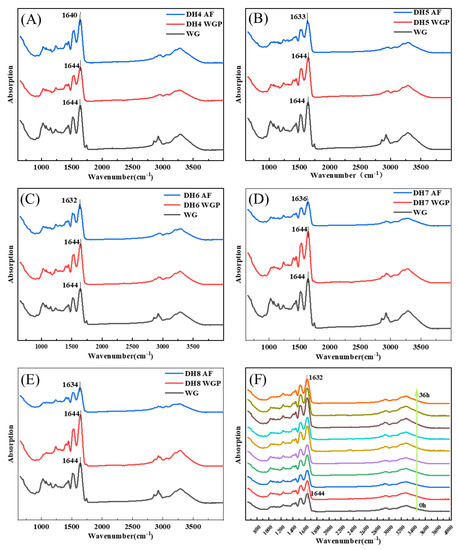 FTIR spectra of different degrees of hydrolysis from WG to WGP to AF. (C) From WG to DH6 AF, the peak of the amide I band moved from 1644 cm−1 to 1632 cm−1. The changes of peaks in the amide I band of other DHs were (A) 1644 cm−1–1640 cm−1 (DH4), (B) 1644 cm−1–1633 cm−1 (DH5), (D) 1644 cm−1–1636 cm−1 (DH7), and (E) 1644 cm−1–1634 cm−1 (DH8), respectively. (F) FTIR spectra show the AF formation process of DH6 WGPs, which was measured every 4 h. The arrow indicates from 0 h to 36 h.
