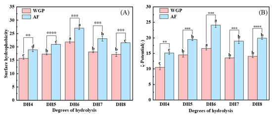 (A) Surface hydrophobicity analysis and (B) ζ-potential analysis of DH4–8 WGPs, DH4–8 AFs. Different letters of the different DH indicate significant differences (p < 0.05). **, ***, **** represents significant difference between two sets of data with the same DH (** p < 0.01, *** p < 0.001, **** p < 0.0001).