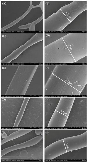SEM images of DH4–8 AFs at 4 k and 12 k times. Image was taken at 4000 times (10 µm) and 12,000 times (4 µm) for each degree of hydrolysis AFs. (A) DH4 AF × 4 k; (B) DH4 AF × 12 k; (C) DH5 AF × 4 k; (D) DH5 AF × 12 k; (E) DH6 AF × 4 k; (F) DH6 AF × 12 k; (G) DH7 AF × 4 k; (H) DH7 AF × 12 k; (I) DH8 AF × 4 k; (J) DH8 AF × 12 k.