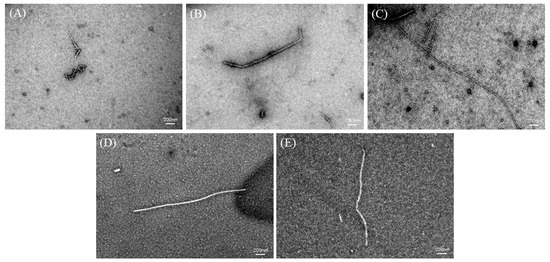 TEM can be used to study the overall morphology of AFs [21,24]. TEM images of the DH4–8 AFs are shown in Figure 6. The DH4 WGPs generated short worm-like AFs. This could be explained by the fact that the DH was too low, resulting in a lack of suitable short peptides to form cross-β structures and continue to grow into AFs. DH5 WGPs generated AFs improved, their length increased, and they were no longer curled together. Compared to DH4 WGPs, DH5 WGPs underwent a more extensive hydrolysis process, resulting in the release of a greater number of short peptides with hydrophobic properties. This enabled DH5 WGPs to effectively form cross-β structures and promote the normal growth of AFs. DH6 WGPs formed straight and the longest AFs among other degrees of hydrolysis. At this stage, the WGP solution contained a significant number of highly hydrophobic and stabilized peptides, resulting in the formation of AFs with the best morphology. This result was also consistent with the ThT fluorescence and FTIR findings. Although the DH7 WGPs also formed straight AFs, they were shorter in length. DH8 WGPs also formed straight AFs, but at a shorter length than DH7. One explanation for these observations is that excessively high levels of hydrolysis cause the peptides in the WGP solution to recombine and form large peptides or amorphous aggregates through non-covalent bonds, including hydrophobic forces and hydrogen bonds [37]. These large peptides or aggregates are unable to further contribute to the formation of AFs [1,25].