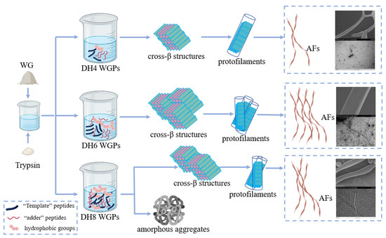 Based on several previous studies, the aim of this study was to investigate the effect of different DHs on WG fibrillation. Using surface hydrophobicity analysis, ζ-potential analysis, FTIR absorption spectroscopy analysis, secondary structure analysis, and gel electrophoresis, the differences among WGPs with different DHs and the effect on AF formation was investigated. AFs were identified by ThT fluorescent assay and FTIR, and morphologically characterized by SEM and TEM.
