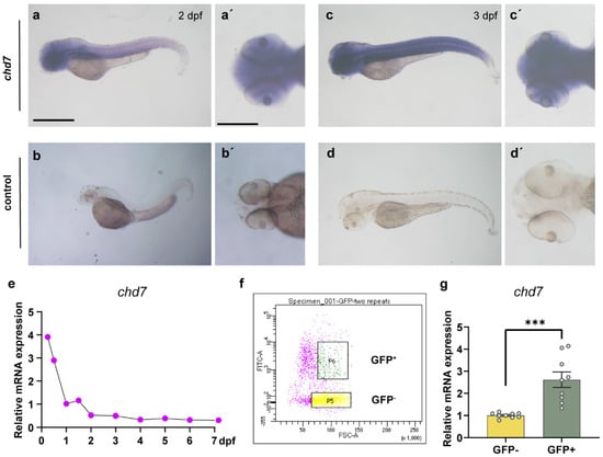 The expression pattern of chd7 at the early stage. (a–d) Zebrafish at 2–3 dpf using WISH displaying high expression of chd7 in the brain, eyes and spinal cord (lateral view). (a’–d’) Dorsal view of the brain. All embryos shown in both the lateral and dorsal view. Scale bar in (a–d), 10 μm; Scale bar in (a’–d’), 5 μm. (e) Q-PCR results showed that chd7 mRNA expression begins at 6 hpf and decreases gradually thereafter. (f) Representative image of FACS analysis of olig2+ cells and olig2− cells from the Tg (olig2: EGFP) line. (g) Real-time Q-PCR results of olig2+ cells and olig2− cells. Data shown as mean ± sem. *** p = 0.0003, unpaired Student’s two-tailed t-test.