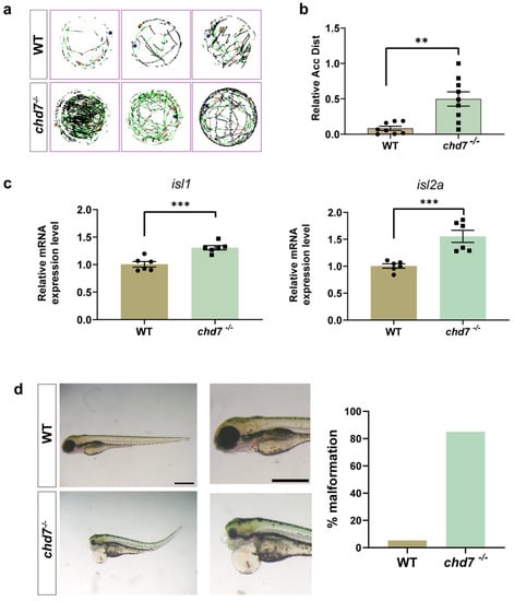 2.3. Knockout of chd7 Caused Hyperactivity and Malformation