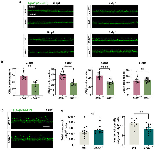 To specifically confirm that the reduced migration of OPCs is caused by a functional loss of chd7, we successfully established chd7 KO strains by removing 16 bp in the first exon of the gene chd7. We observed that at 3, 4, and 5 dpf, the number of olig2+ cells that migrated dorsally was significantly reduced in the chd7−/− group compared to the chd7+/+ group, and the difference was diminished at 6 dpf (Figure 4a,b). Interestingly, we found no significant difference in the number of total oilg2+ cells between the two groups (Figure 4c,d). These results suggested that loss of CHD7 protein causes delayed OPC migration, but eventually a total migration similar to that of chd7+/+ can be achieved.