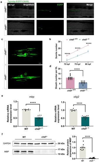 The process of myelination of zebrafish OLs starts at the head and then gradually goes to the tail [34]. Moreover, the axons of Mauthner cells are the thickest axons in the zebrafish spinal cord, and their axons are the first to be myelinated [35]. Then, utilizing this time series, we used the number of somites corresponding to the location of myelin-coated Mauthner cell axons as a criterion to assess the process of myelination. We identified that at 70 hpf, the chd7+/+ group had wrapped about 9 somites in length, while the KO group had wrapped only about 2 somites. At 75 hpf and 80 hpf, the length of myelin wrapping in the KO group was also much less than that in the WT group (Figure 5a,b). To further examine the variations in myelination, we randomly labeled individual mature OLs with plasmid UAS-mbp-EGFP-CAAX and observed that the number of individual OL-wrapped myelin segments in the chd7−/− group was approximately 45% smaller than the chd7+/+ group (Figure 5c,d).