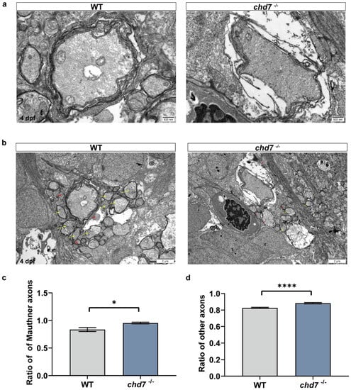 In this study, 5 Mauthner cells and 102 myelinated axons cells of chd7+/+ group were measured while 6 Mauthner cells and 53 myelinated axons cells of chd7−/− group were measured.
