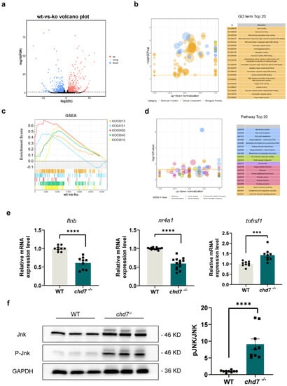 Chd7 may regulate myelin development via the MAPK pathway. (a) Volcano plot showing each gene plotted according to its log2 fold change. All highly differentially expressed genes with p < 0.05 are in orange with fold change > 1.5. In total, 589 genes were significantly up-regulated and 438 genes were significantly down-regulated. (b) Gene ontology showing the 20 most significant functional classifications for differential gene enrichment. (c) Gene set enrichment analysis determining the significantly down-regulated pathway activity in the chd7 knockout group. (d) Kyoto Encyclopedia of Genes and Genomes analysis determining the top 20 enriched pathways of the differentially expressed genes. (e) Real-time Q-PCR results showed that the target genes of protein CHD7 are significantly changed in expression after chd7 KO. (f) JNK activation via phosphorylation was increased in knockout group as shown via Western blot quantification. Data shown as mean ± sem. unpaired Student’s two-tailed t-test, *** p = 0.001, **** p < 0.0001.