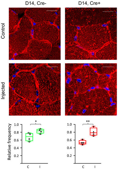 Skeletal muscle injury was accomplished via a BaCl2 injection. A quantity of 20 µL of 1.2% BaCl2 (dissolved in physiological saline) was injected to the left m. tibialis anterior muscle (TA) of the BL6/C57, the Cre− and the Cre+ mice (right m. tibialis anterior muscle was the non-treated control). The mice were sacrificed 4 and 14 days later followed by removal of TA.