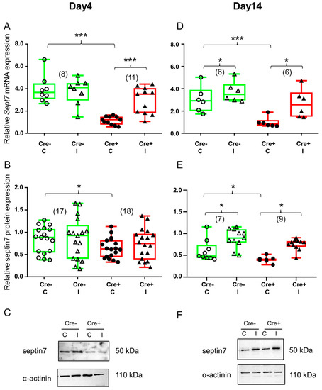 BaCl2 injection resulted in elevated septin7 expression. Green color represents Cre− data and red color refers to Cre+ data. Numbers in brackets indicate the number of muscle samples. (A) Relative Sept7 mRNA expression (normalized to AP3D1 as the internal control) in m. tibialis anterior from young Cre− and Cre+ mice 4 days after BaCl2 injection for control (C) and injected (I) legs. (B) Relative septin7 protein expression (normalized to α-actinin as the internal control) in m. tibialis anterior from young Cre− and Cre+ mice 4 days after injection. (C) Representative images of Western blot showing expression changes in septin7 protein on day 4. (D) Relative Sept7 mRNA expression in m. tibialis anterior from young Cre− and Cre+ mice 14 days after injection. (E) Relative septin7 protein expression in m. tibialis anterior from young Cre− and Cre+ mice 14 days after injection. (F) Representative images of Western blot showing expression changes in septin7 protein on day 14. Asterisks indicate statistically significant difference (* p < 0.05, *** p < 0.001 Student’s t-test). Actual p values when p > 0.001 are: (A) Cre− C vs. Cre− I p = 0.76; (B) Cre− C vs. Cre+ C p = 0.019; Cre− C vs. Cre− I p = 0.75; Cre+ C vs. Cre+ I p = 0.62; (D) Cre− C vs. Cre− I p= 0.010, Cre+ C vs. Cre+ I p = 0.017; (E) Cre− C vs. Cre+ C p = 0.048; Cre− C vs. Cre− I p = 0.04; Cre+ C vs. Cre+ I p = 0.031.