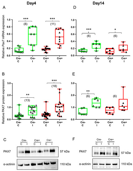 Skeletal muscle injury is reflected in the upregulation of satellite cell marker PAX7. Green color represents Cre− data and red color refers to Cre+ data. Numbers in brackets indicate the number of muscle samples. (A) Relative Pax7 mRNA expression (normalized to AP3D1 as the internal control) in m. tibialis anterior from young Cre− and Cre+ mice 4 days after BaCl2 injection for control (C) and injected (I) legs. (B) Relative PAX7 protein expression (normalized to α-actinin as the internal control) in m. tibialis anterior from young Cre− and Cre+ mice 4 days after injection. (C) Representative images of Western blot showing expression changes in PAX7 protein on day 4. (D) Relative Pax7 mRNA expression in m. tibialis anterior from young Cre− and Cre+ mice 14 days after injection. I Relative PAX7 protein expression in m. tibialis anterior from young Cre− and Cre+ mice 14 days after injection. (F) Representative images of Western blot showing expression changes in PAX7 protein on day 14. Asterisks indicate statistically significant difference (* p < 0.05, ** p < 0.005, *** p < 0.001 Student’s t-test). Actual p values when p > 0.001 are: (B); Cre− C vs. Cre− I p = 0.002; (D) Cre+ C vs. Cre+ I p = 0.010; (E) Cre− C vs. Cre− I p = 0.002, Cre+ C vs. Cre+ I p = 0.086.