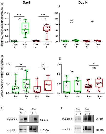 Regeneration marker myogenin is increased during the early stage of regeneration. Green color represents Cre− data and red color refers to Cre+ data. Numbers in brackets indicate the number of muscle samples. (A) Relative myogenin mRNA expression (normalized to AP3D1 as the internal control) in m. tibialis anterior from young Cre− and Cre+ mice 4 days after BaCl2 injection for control (C) and injected (I) legs. (B) Relative myogenin protein expression (normalized to α-actinin as the internal control) in m. tibialis anterior from young Cre− and Cre+ mice 4 days after injection. (C) Representative images of Western blot images showing expression changes in myogenin protein on day 4. (D) Relative myogenin mRNA expression in m. tibialis anterior from young Cre− and Cre+ mice 14 days after injection. (E) Relative myogenin protein expression in m. tibialis anterior from young Cre− and Cre+ mice 14 days after injection. (F) Representative images of Western blot showing expression changes in myogenin protein on day 14. Asterisks indicate statistically significant difference (* p < 0.05, ** p < 0.005, *** p < 0.001 Student’s t-test). Actual p values when p > 0.001 are: (B) Cre− C vs. Cre− I p = 0.002; Cre+ C vs. Cre+ I p = 0.002; (D) Cre− C vs. Cre− I p = 0.135; Cre+ C vs. Cre+ I p = 0.308; (E) Cre− C vs. Cre− I p = 0.445; Cre+ C vs. Cre+ I p = 0.022.