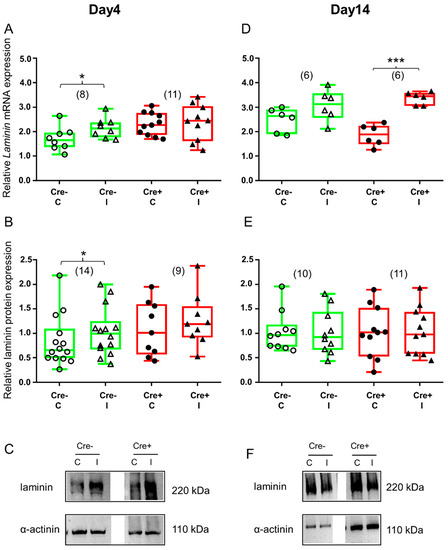 ECM remodeling is different in Cre+ versus Cre− mice as reflected in the changes in laminin expression. Green color represents Cre− data and red color refers to Cre+ data. Numbers in brackets indicate the number of muscle samples. (A) Relative laminin mRNA expression (normalized to AP3D1 as the internal control) in m. tibialis anterior from young Cre− and Cre+ mice 4 days after BaCl2 injection for control (C) and injected (I) legs. (B) Relative laminin protein expression (normalized to α-actinin as the internal control) in m. tibialis anterior from young Cre− and Cre+ mice 4 days after injection. (C) Representative images of Western blot showing expression changes in laminin protein on day 4. (D) Relative laminin mRNA expression in m. tibialis anterior from young Cre− and Cre+ mice 14 days after injection. (E) Relative laminin protein expression in m. tibialis anterior from young Cre− and Cre+ mice 14 days after injection. (F) Representative images of Western blot showing expression changes in laminin protein on day 14. Asterisks indicate statistically significant difference (* p < 0.05, *** p < 0.001 Student’s t-test). Actual p values when p > 0.001 are: (A) Cre− C vs. Cre− I p = 0.002; Cre+ C vs. Cre+ I p = 0.006, Cre+ C vs. Cre+ I p = 0.874; (B) Cre− C vs. Cre− I p = 0.039; Cre+ C vs. Cre+ I p = 0.46; (D) Cre− C vs. Cre− I p = 0.126; (E) Cre− C vs. Cre− I p = 0.92; Cre+ C vs. Cre+ I p = 0.90.